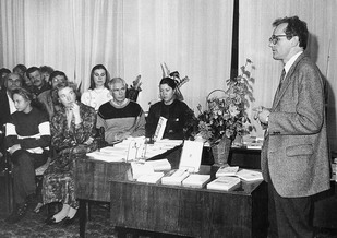 А.И.Солженицын выступает на открытии Библиотеки-фонда «Русское Зарубежье». Слева — Н.Д.Солженицына, справа — Н.А.Струве. 1995 |