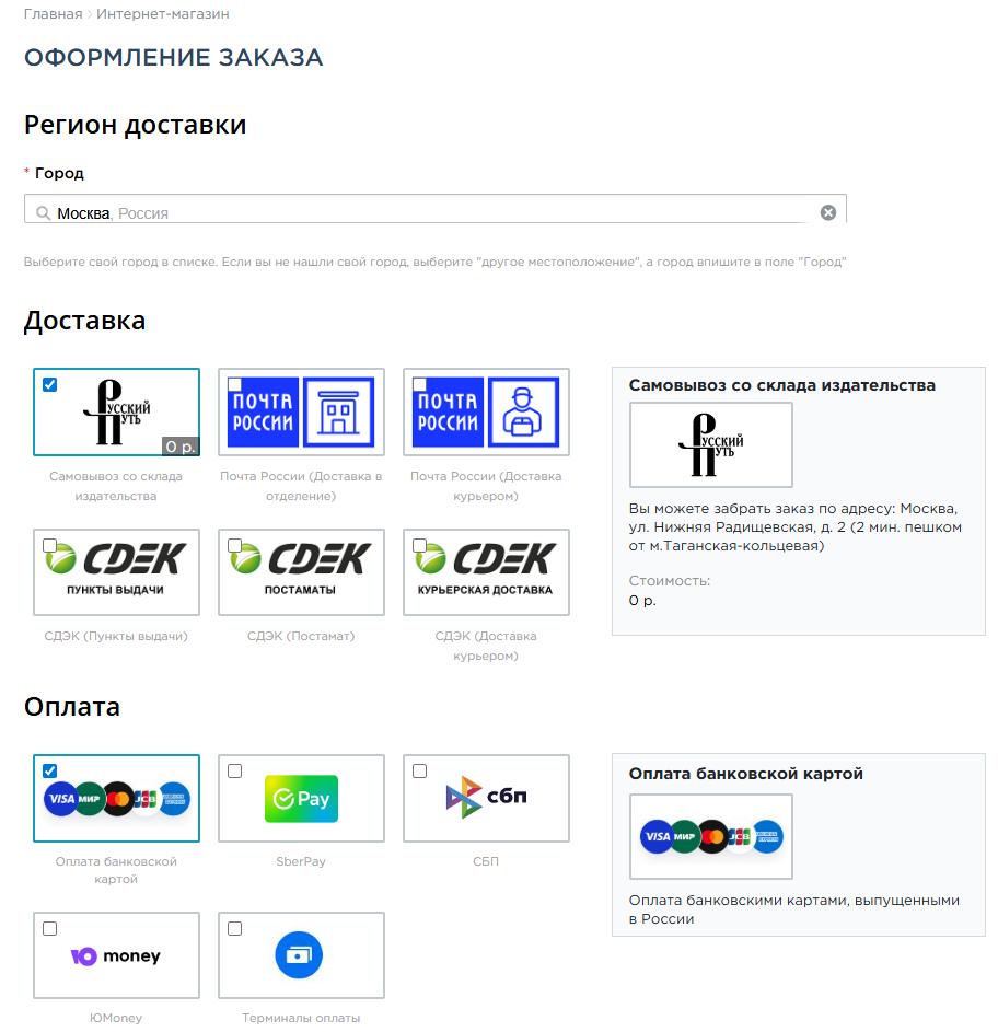 4. Выберите один из предложенных способов доставки товара (самовывоз, Почта России, СДЭК, Boxberry) и оплаты (банковская карта, SberPay, ЮMoney, терминалы оплаты).