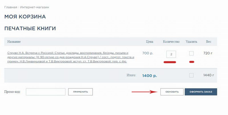 2. Перейдите в корзину (в верхнем правом углу экрана). Проверьте, все ли необходимые книги помещены в корзину, правильно ли отмечено количество экземпляров. При необходимости скорректируйте позиции и нажмите кнопку «Обновить». Если все верно, нажмите кнопку «Оформить заказ».