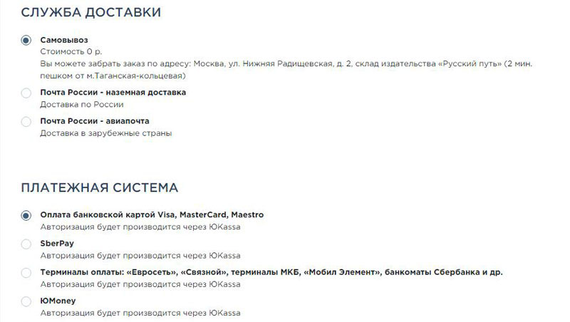 4. Выберите один из предложенных способов доставки товара (самовывоз, Почта России, СДЭК, Boxberry) и оплаты (банковская карта, SberPay, ЮMoney, терминалы оплаты).